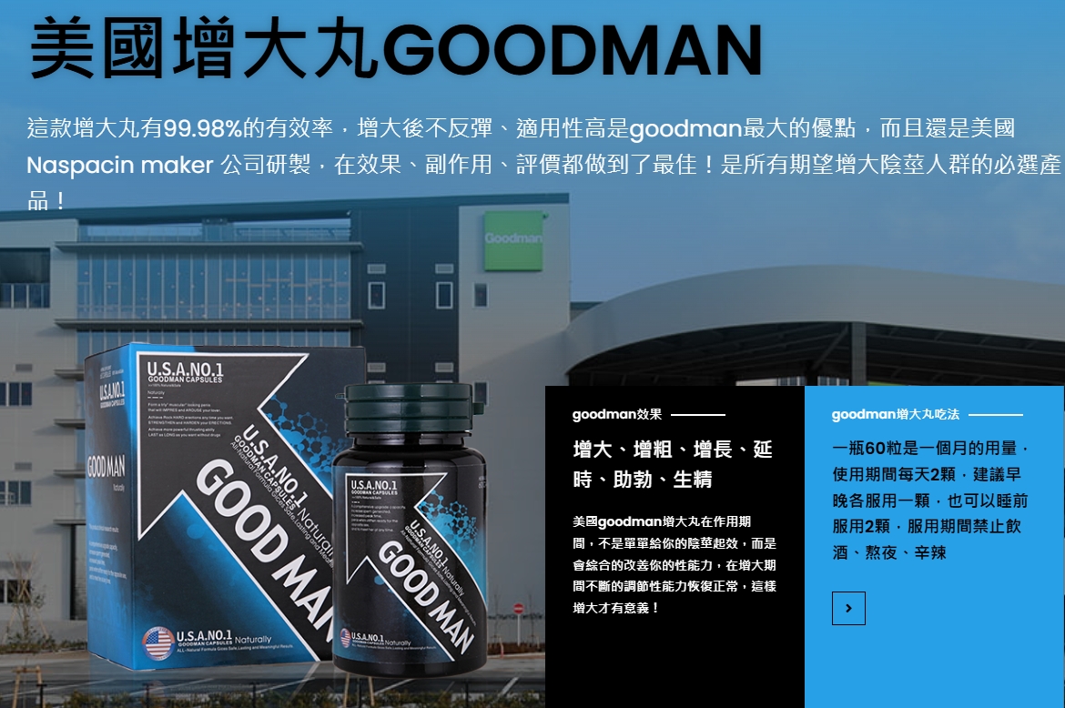 美國GOODMAN增大丸是來自美國Naspacin Maker藥廠的男性專用保健品,以天然、安全、有效為核心理念,針對陰莖短小、勃起不堅、早洩、性慾低下等常見男性困擾,提供科學化的解決方案。產品融合深海鯊魚睪丸萃取物、L-精胺酸與多種草本精華,具備增大、增粗、助勃、延時、補腎強精等多重功效,是目前市面上少數同時具備陰莖外型改善+性功能強化效果的男性複合配方保健品之一,深受全球使用者信賴與推薦。