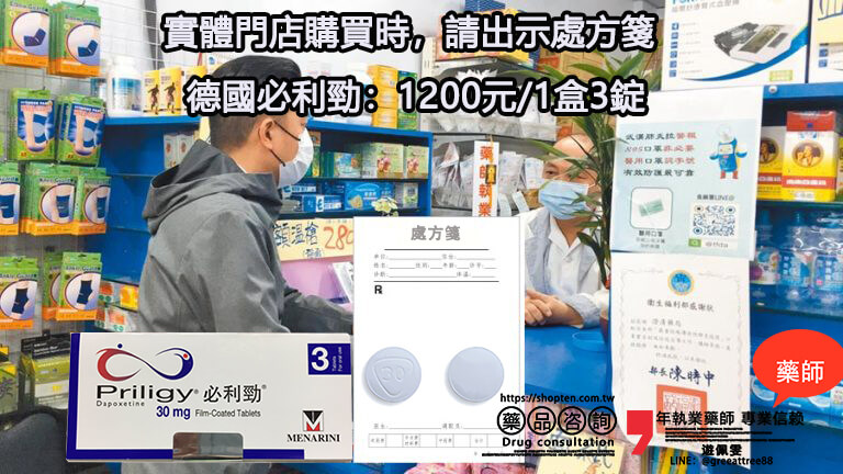 目前在各大線上藥局購買原廠必利勁(Priligy)的價格,與實體藥局相差不大,單盒(3顆裝)大約在 NT$1100 左右。由於許多實體藥局都設有官方網站或線上商城,產品來源安全有保障,價格也相對透明穩定,波動通常不超過 NT$200。