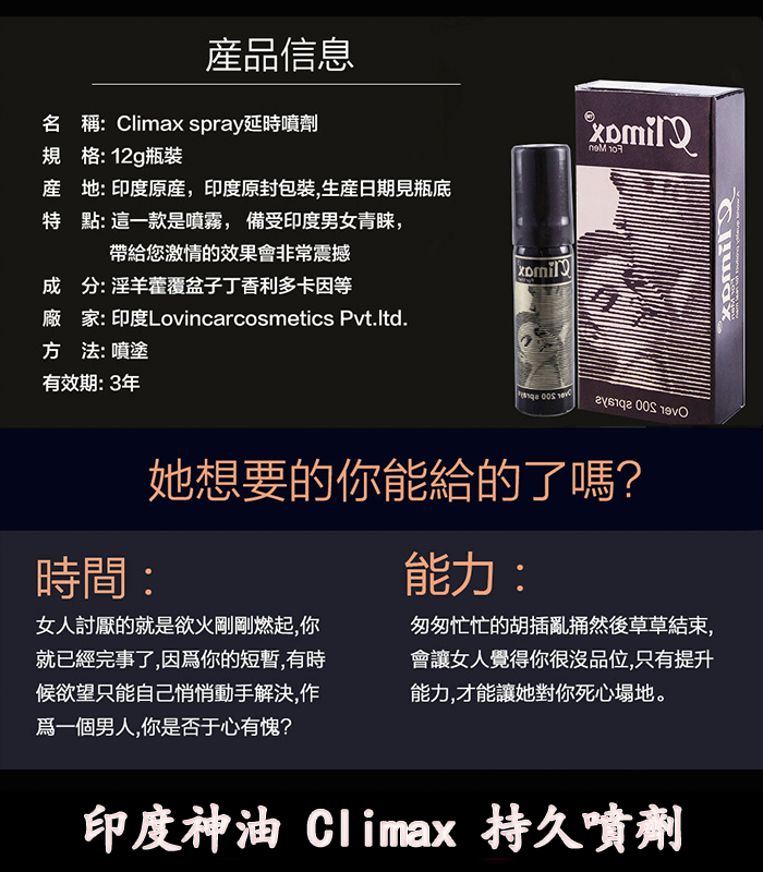 印度神油 Climax 是一款來自印度的傳統男性延時噴劑,專為改善早洩、延長性愛時間所設計。產品以天然草本精華為主成分,能在短時間內幫助男性降低陰莖敏感度,有效延長射精時間,提升性滿意度與自信心。