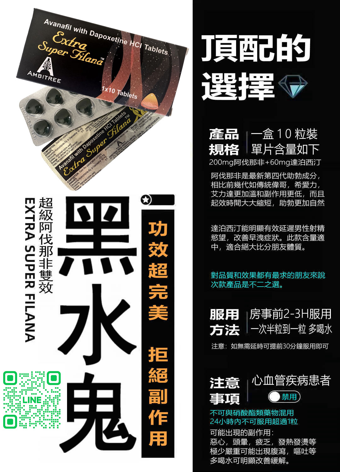 超級黑水鬼 Extra Super Filana 是一款專為男性打造的雙效壯陽藥,結合強力成分 阿伐那非(Avanafil) 與 達泊西汀(Dapoxetine),可同步改善 勃起功能障礙(ED) 與 早洩(PE),有效延長性愛時間、提升勃起硬度與穩定度,幫助男性恢復信心與性生活品質。