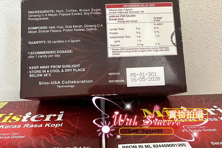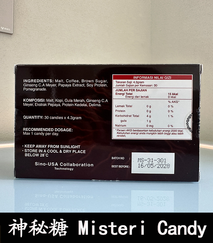 Misteri Candy 神秘糖(印尼版汗馬糖) 承襲經典草本精力配方,並全面升級成分濃度與營養均衡度。每一顆皆由印尼原廠嚴格監製,採獨立鋁箔密封包裝、安全與衛生,讓每位使用者都能感受尊榮級的滋補體驗與持久精力。
