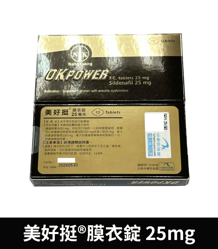 美好挺 OKPOWER 25mg 是台灣研發製造的合法壯陽藥品,主成分為西地那非(Sildenafil)25毫克,是威而鋼的學名成分。此產品特別針對初次接觸助勃藥物者、輕度勃起功能障礙(ED)患者、以及對高劑量副作用較為敏感者設計。提供溫和穩定的藥效,協助男性在性刺激下恢復自然勃起能力,提升性生活品質。